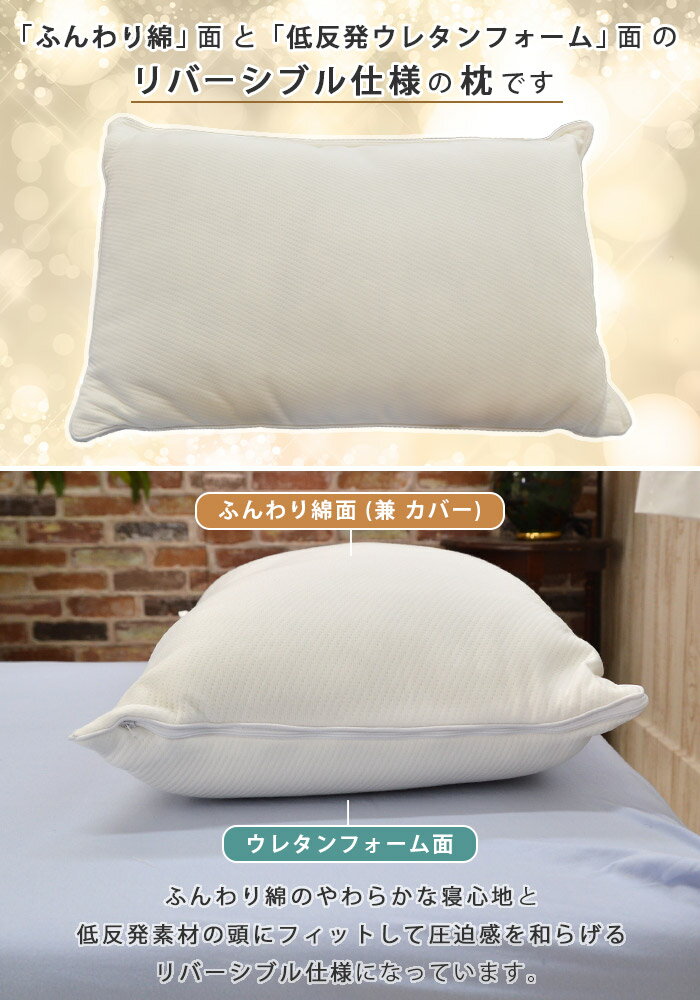 「ふんわり綿のやわらかな寝心地」と「頭にフィットする低反発素材」 2つの仕様からお好きな寝心地を選べるリバーシブル仕様の枕です。